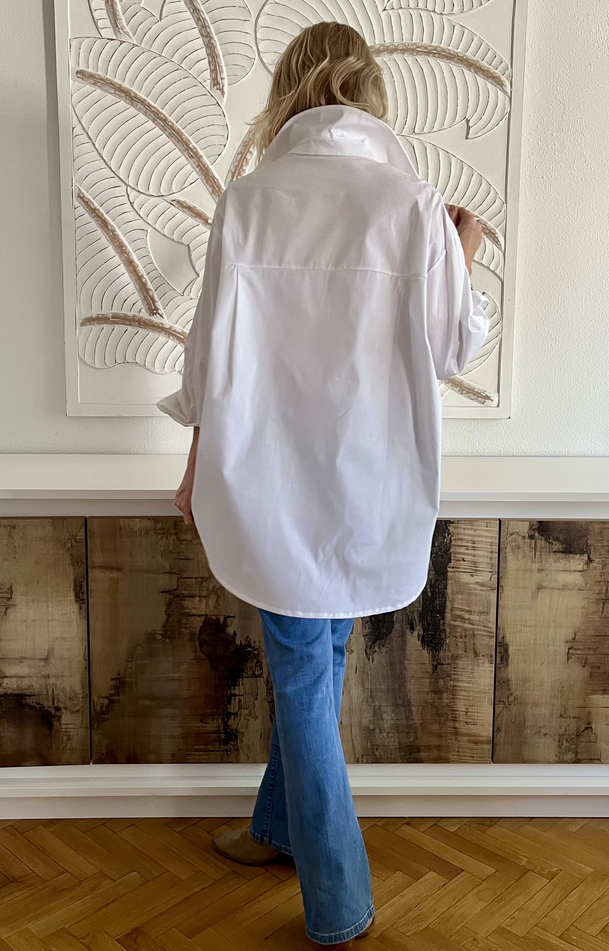 Cuenta con un cuello camisero tradicional, manga larga (que en la imagen se lleva remangada de forma casual) y un bajo asimétrico, siendo ligeramente más larga por detrás para una caída más fluida.