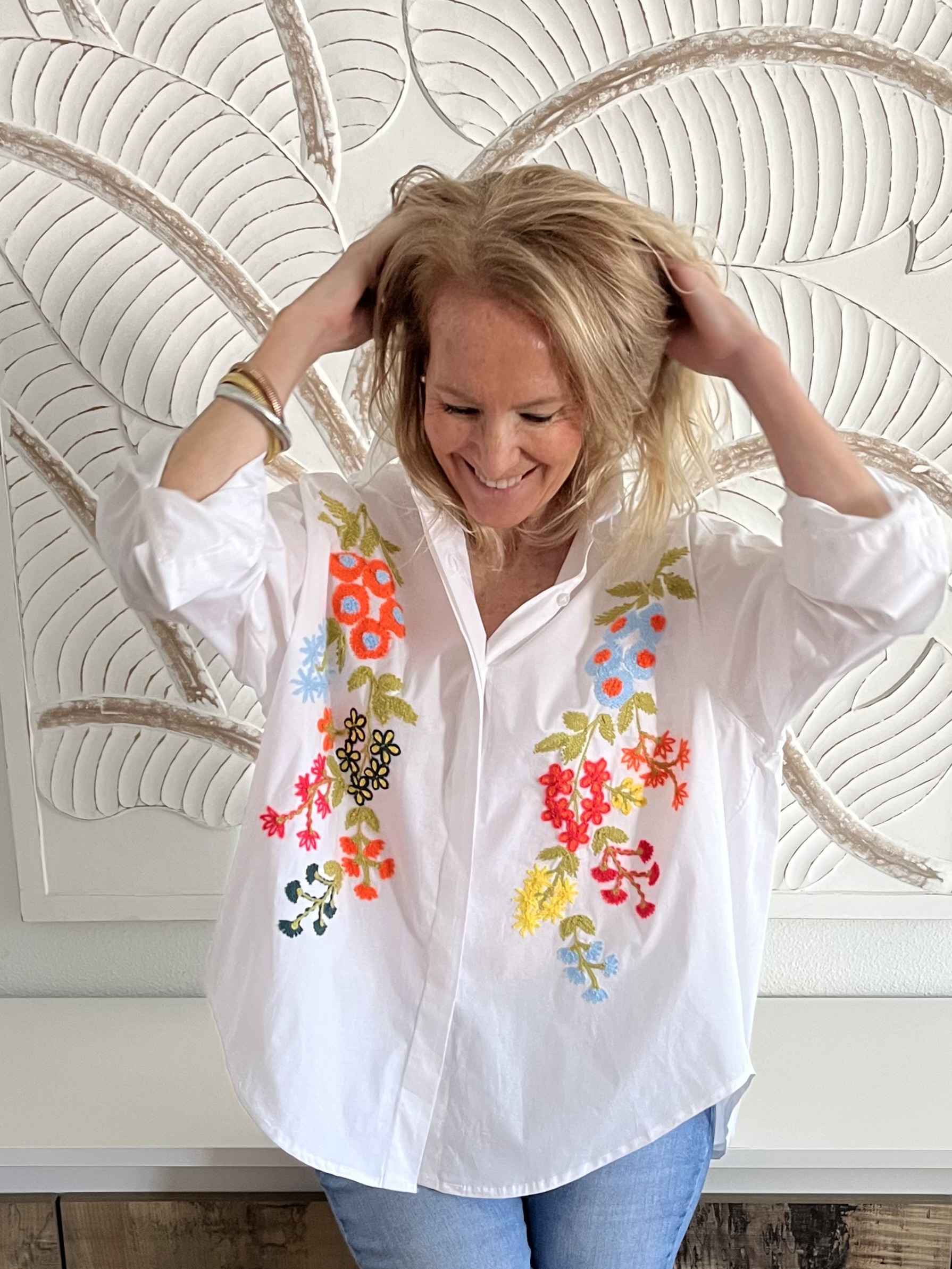 Lo más llamativo son sus bordados florales multicolores situados en la parte delantera. Estos motivos incluyen flores en tonos naranja, rojo, amarillo y negro, junto con hojas verdes, aportando un toque artesanal y alegre.