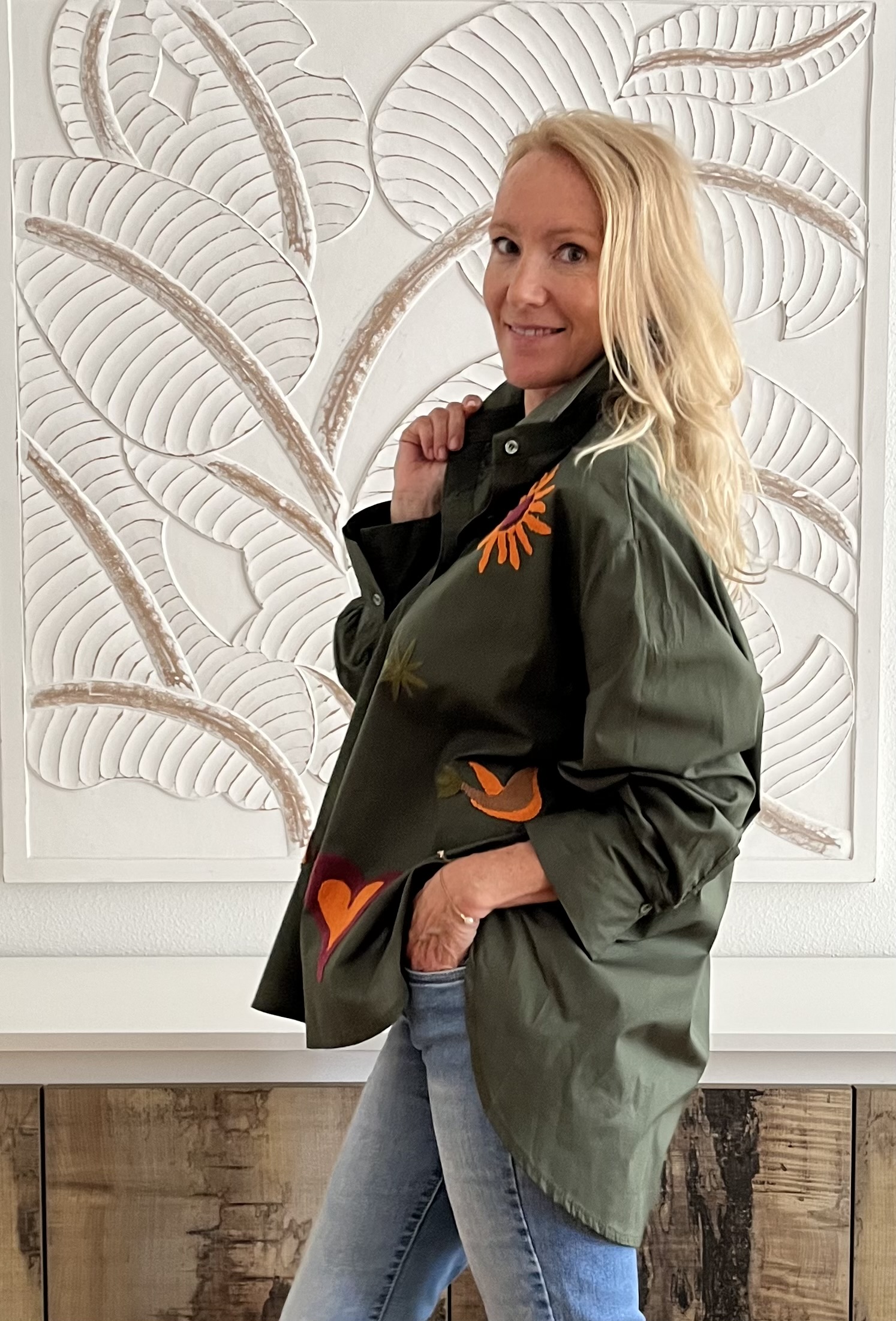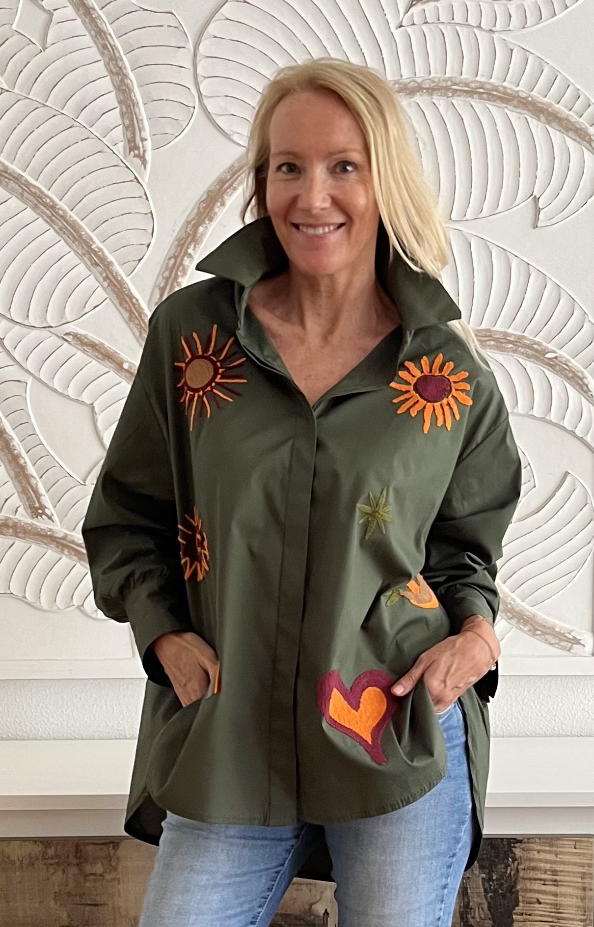 Blusa verde militar, de algodón estilo oversize, decorada con bordados coloridos de inspiración boho. Los detalles incluyen soles, estrellas, corazones, arcoíris y símbolos vibrantes que aportan un toque alegre y artístico. De corte holgado y manga larga, es una prenda cómoda y versátil, ideal para combinar con jeans o pantalones casuales.