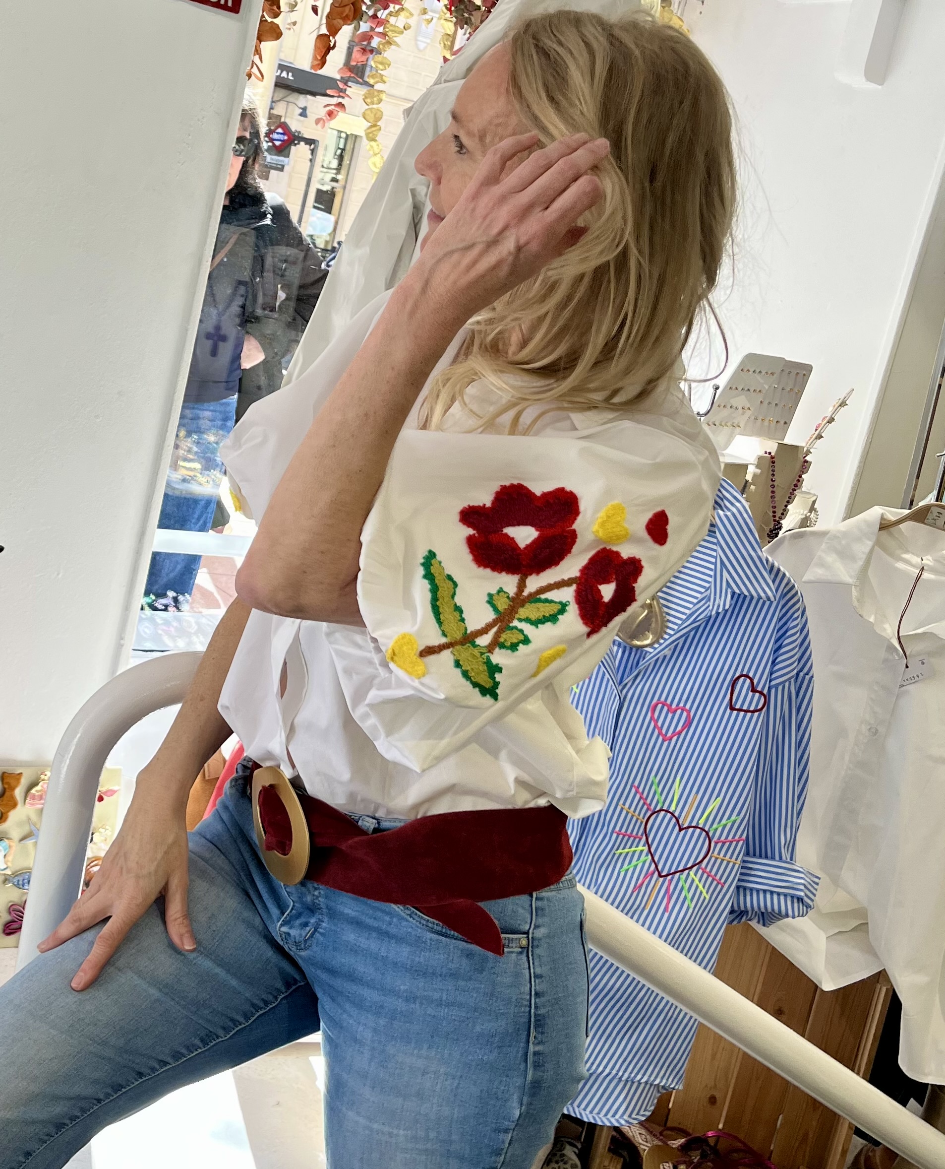 Camisa blanca de mangas abullonadas y con bordados de color.