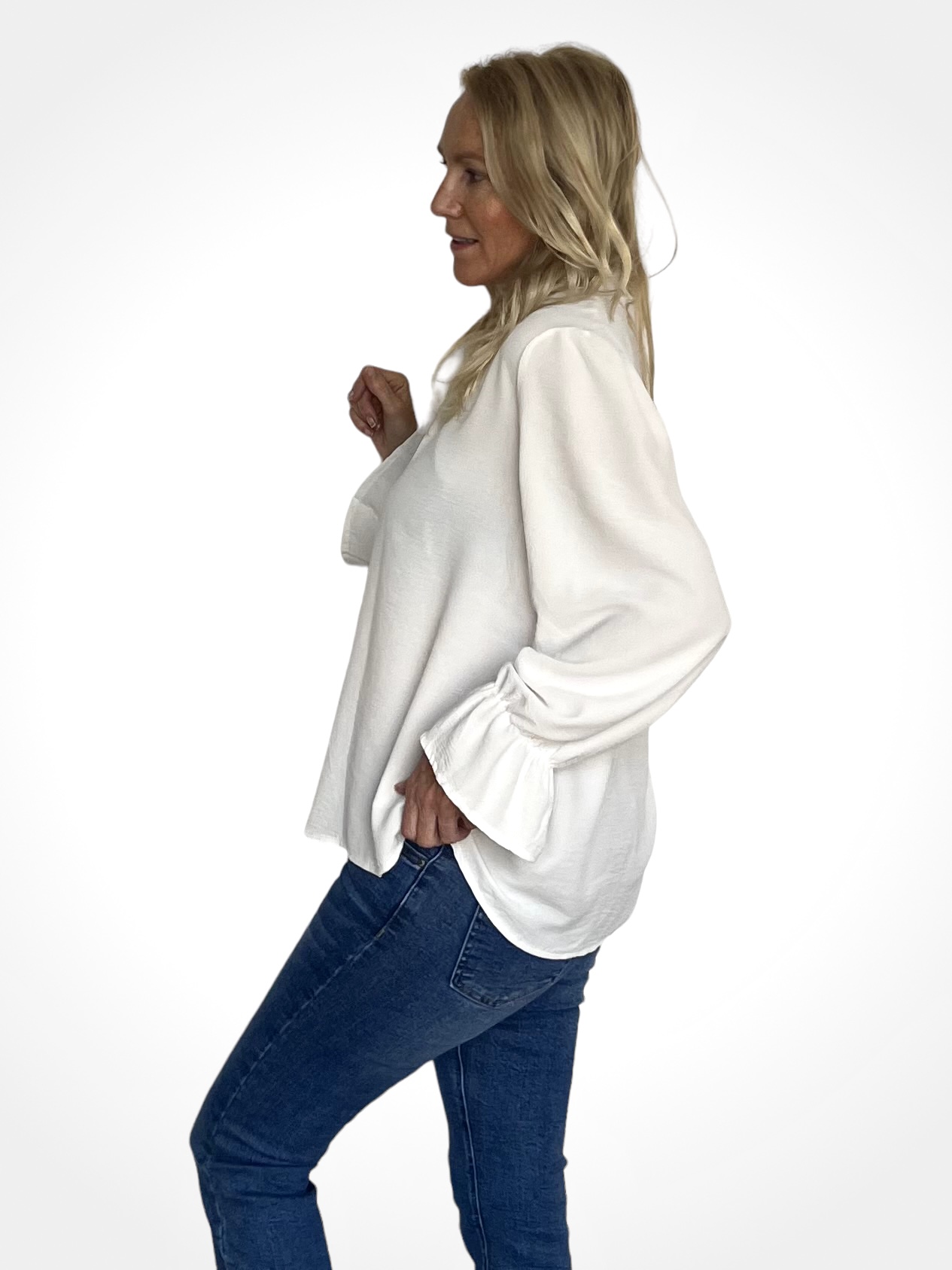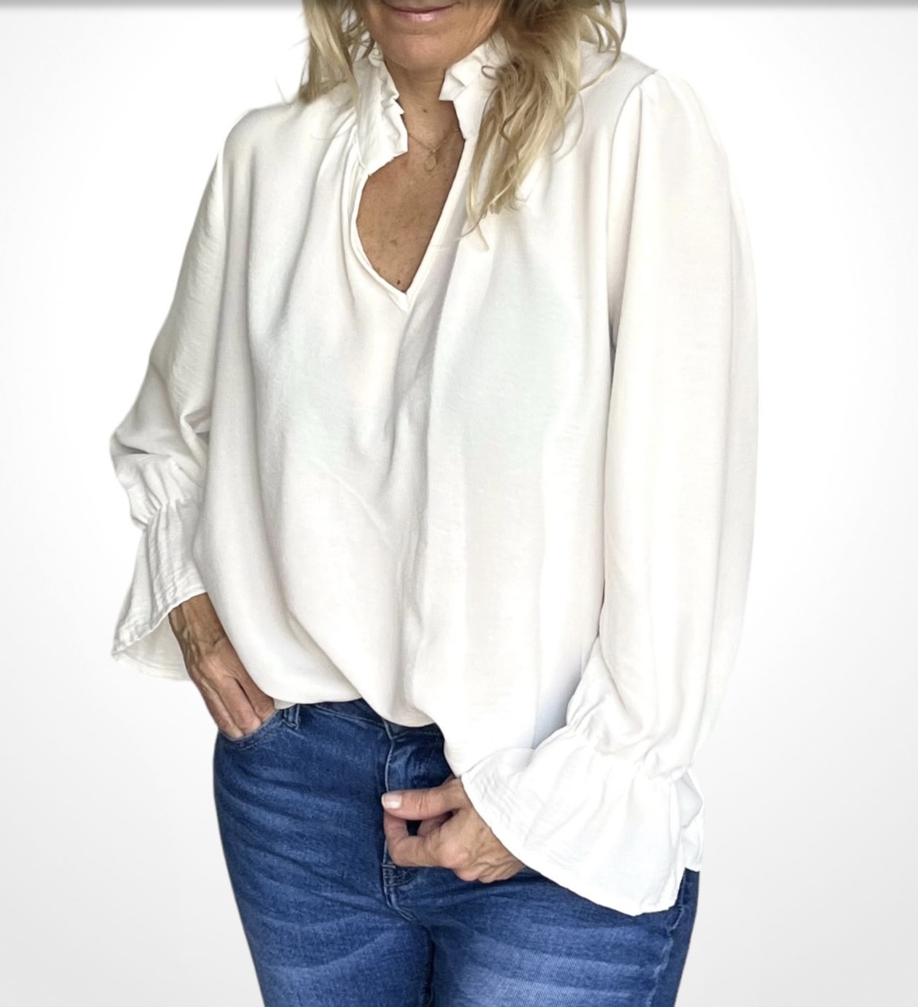 Elegante y versátil, esta blusa de manga larga en tono blanco,es una pieza imprescindible en cualquier guardarropa. Con un delicado cuello fruncido y un sutil escote en V, aporta un toque femenino y sofisticado. Sus mangas con ligero volumen y puños recogidos añaden un aire romántico sin perder comodidad.