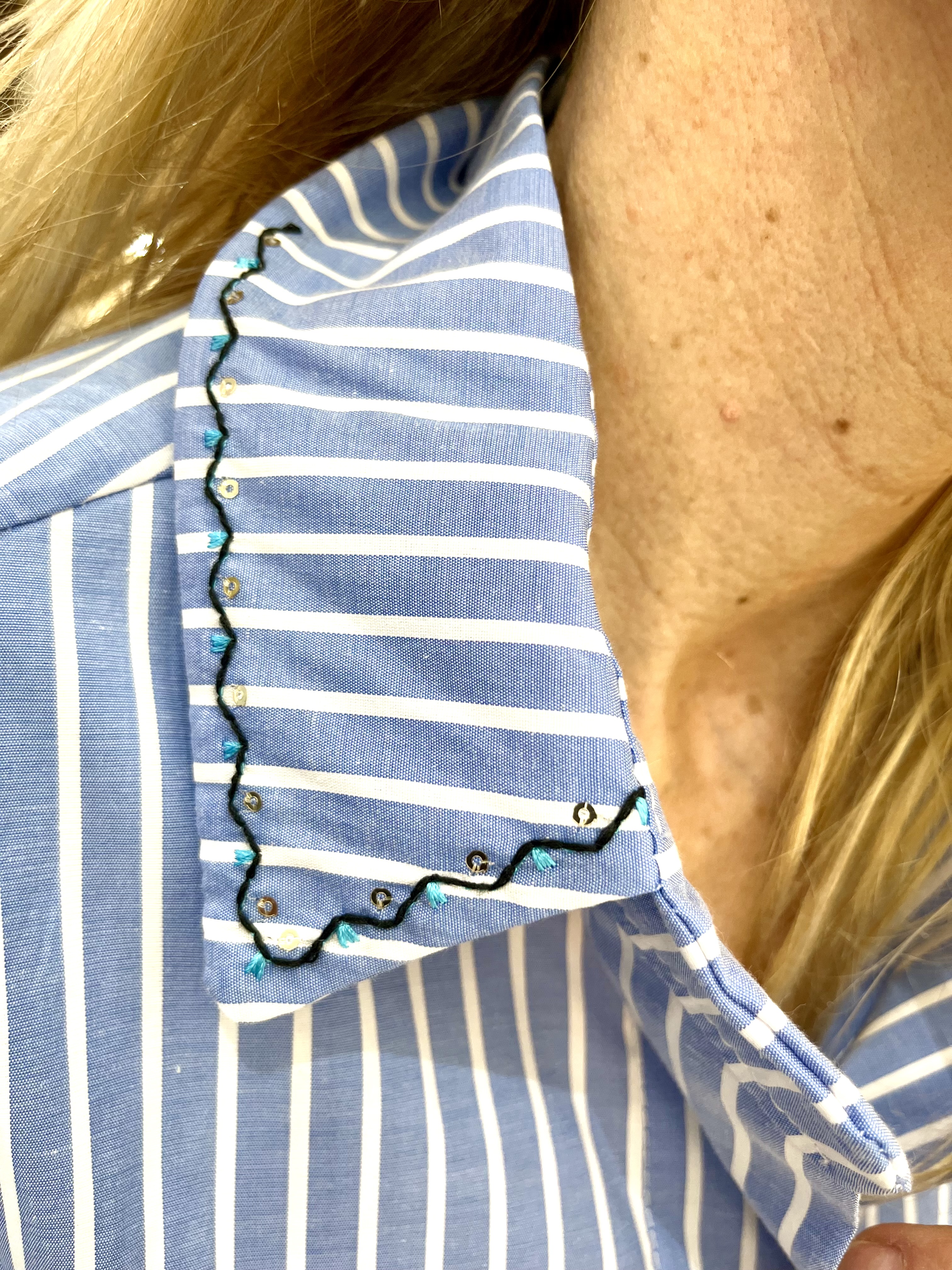 El elemento central son los botones joya en forma de “ Ojo Turco”.Estos detalles tienen un a acabado en lentejuelas plateadas.