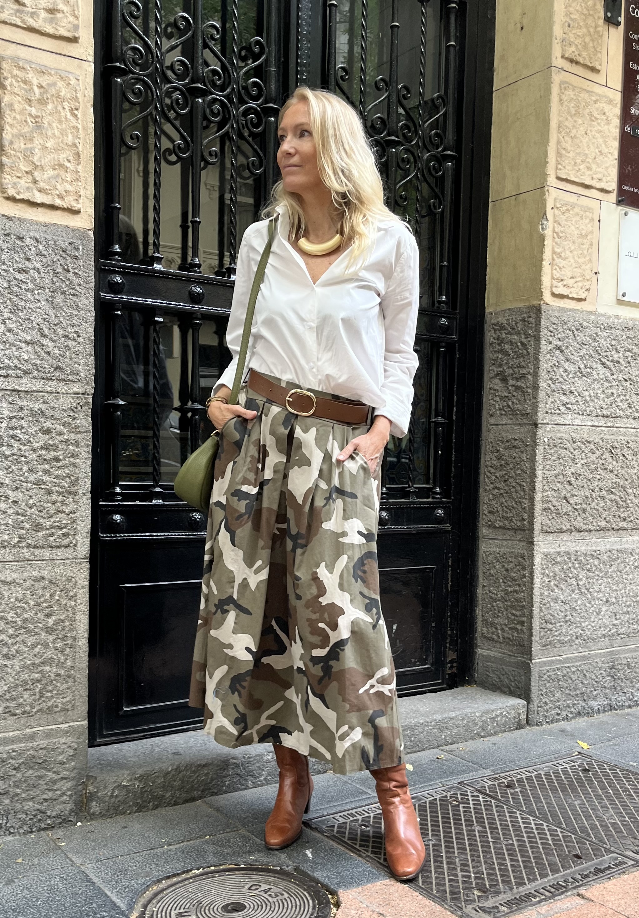 Falda amplia de corte midi con diseño fluido y movimiento natural. Confeccionada en tejido ligero y cómodo, presenta un original estampado de camuflaje en tonos tierra que aporta un estilo moderno y versátil. Cuenta con pliegues frontales que realzan la silueta y bolsillos laterales funcionales. Ideal para combinar tanto con camisas clásicas como con prendas casuales para un look urbano y actual.