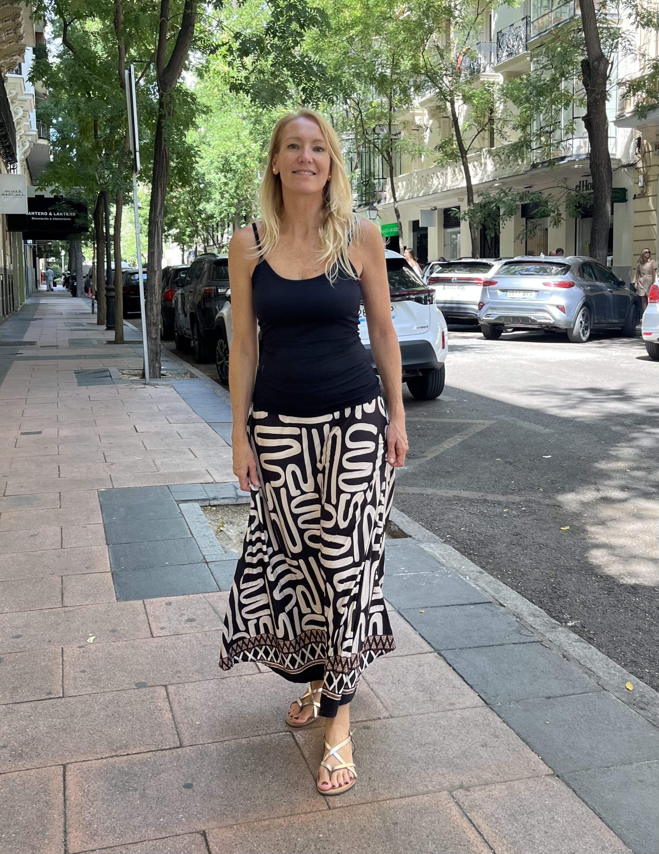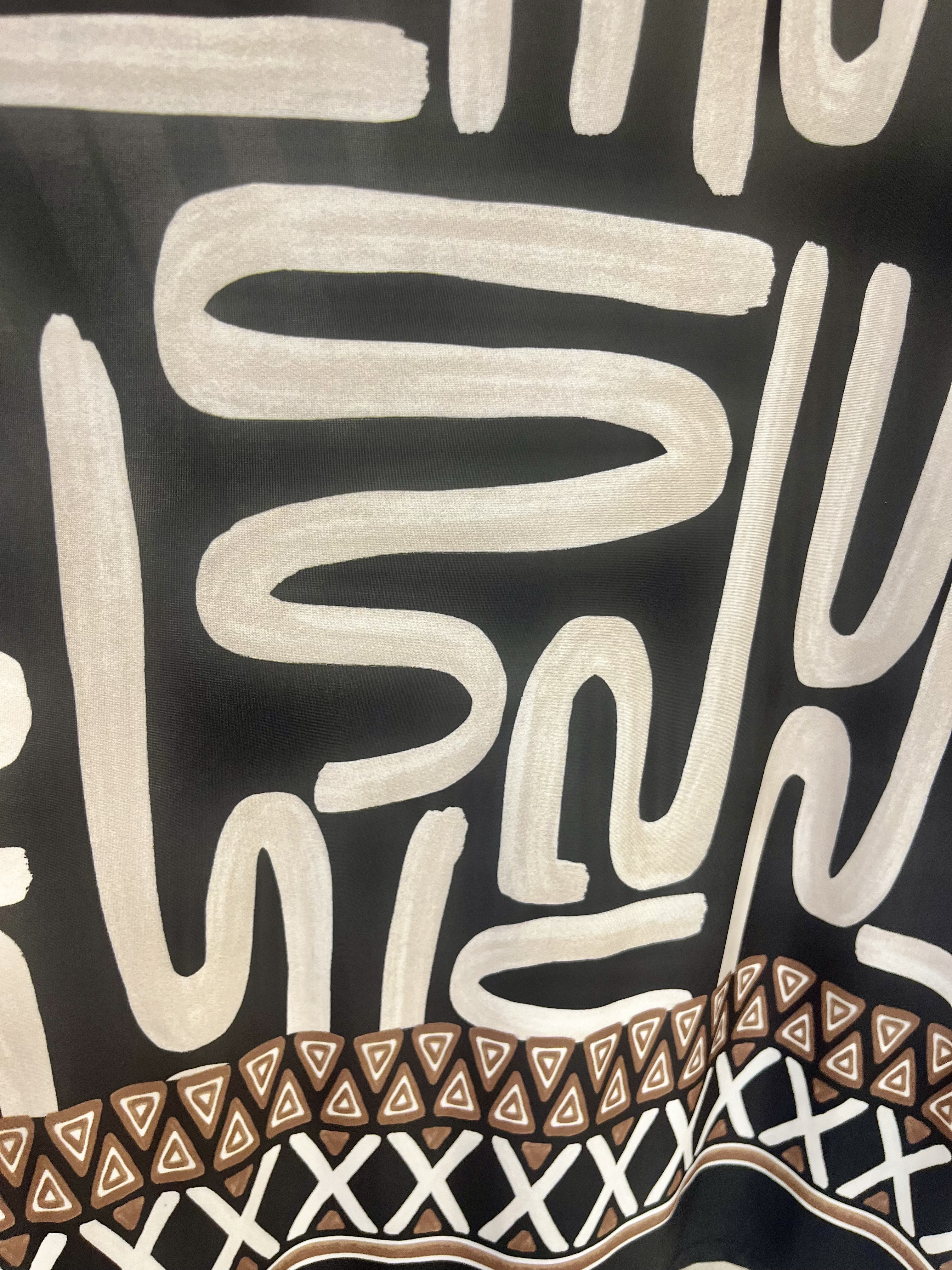 Falda larga de seda fría, en tonos negros y beige.