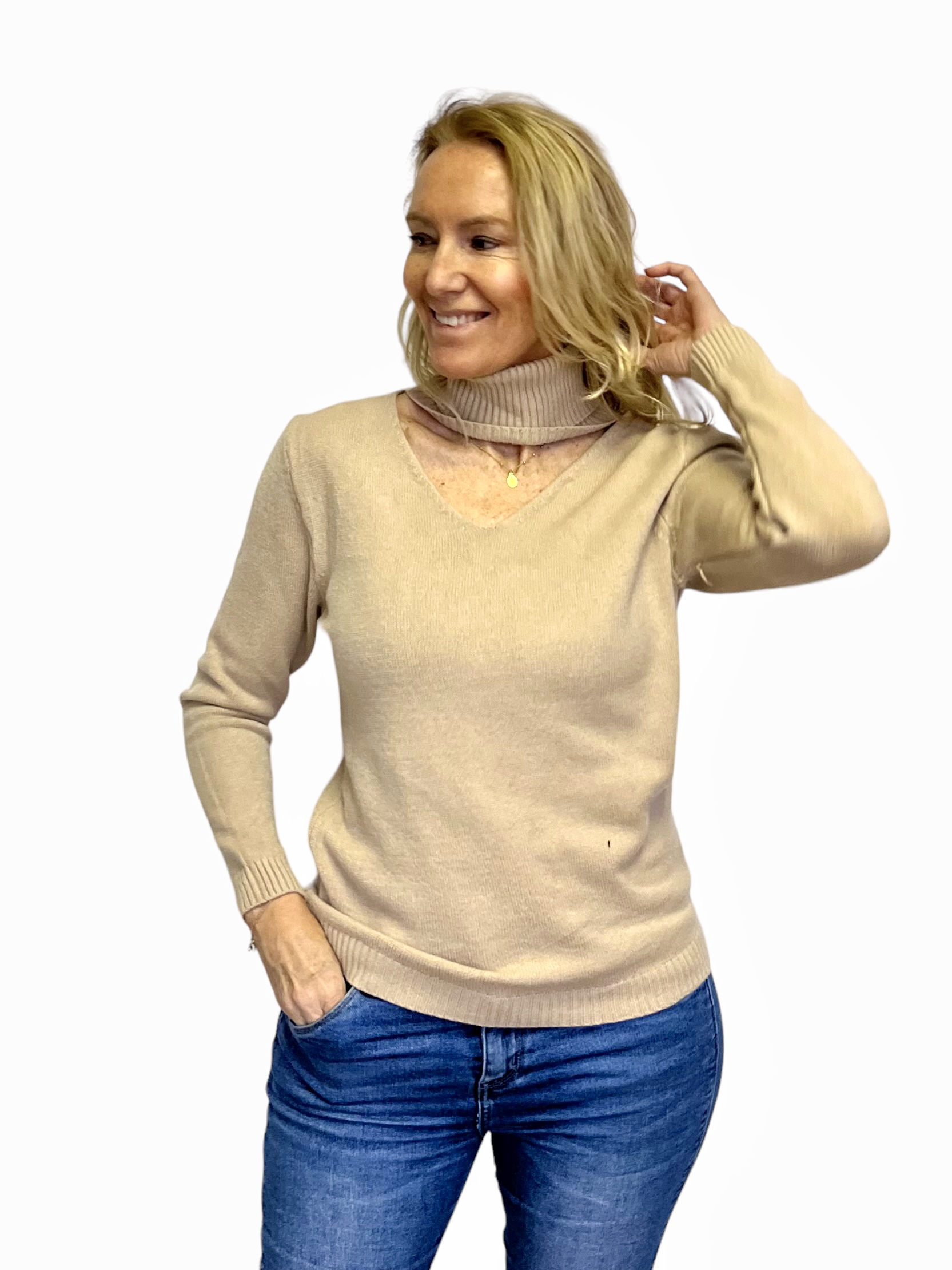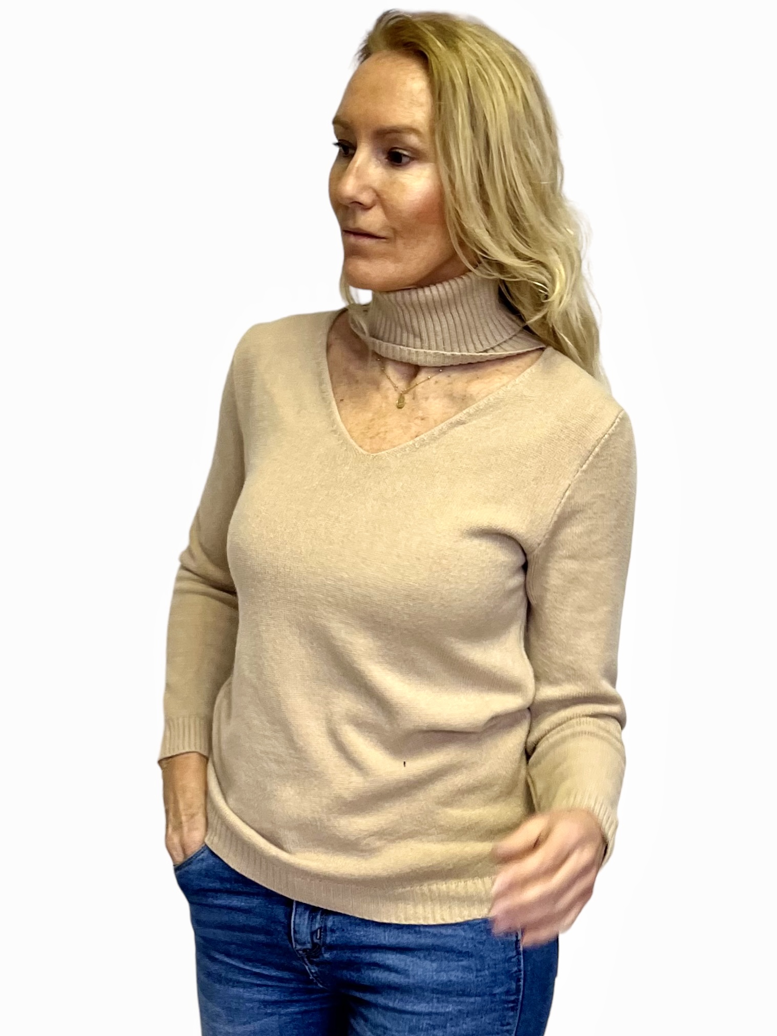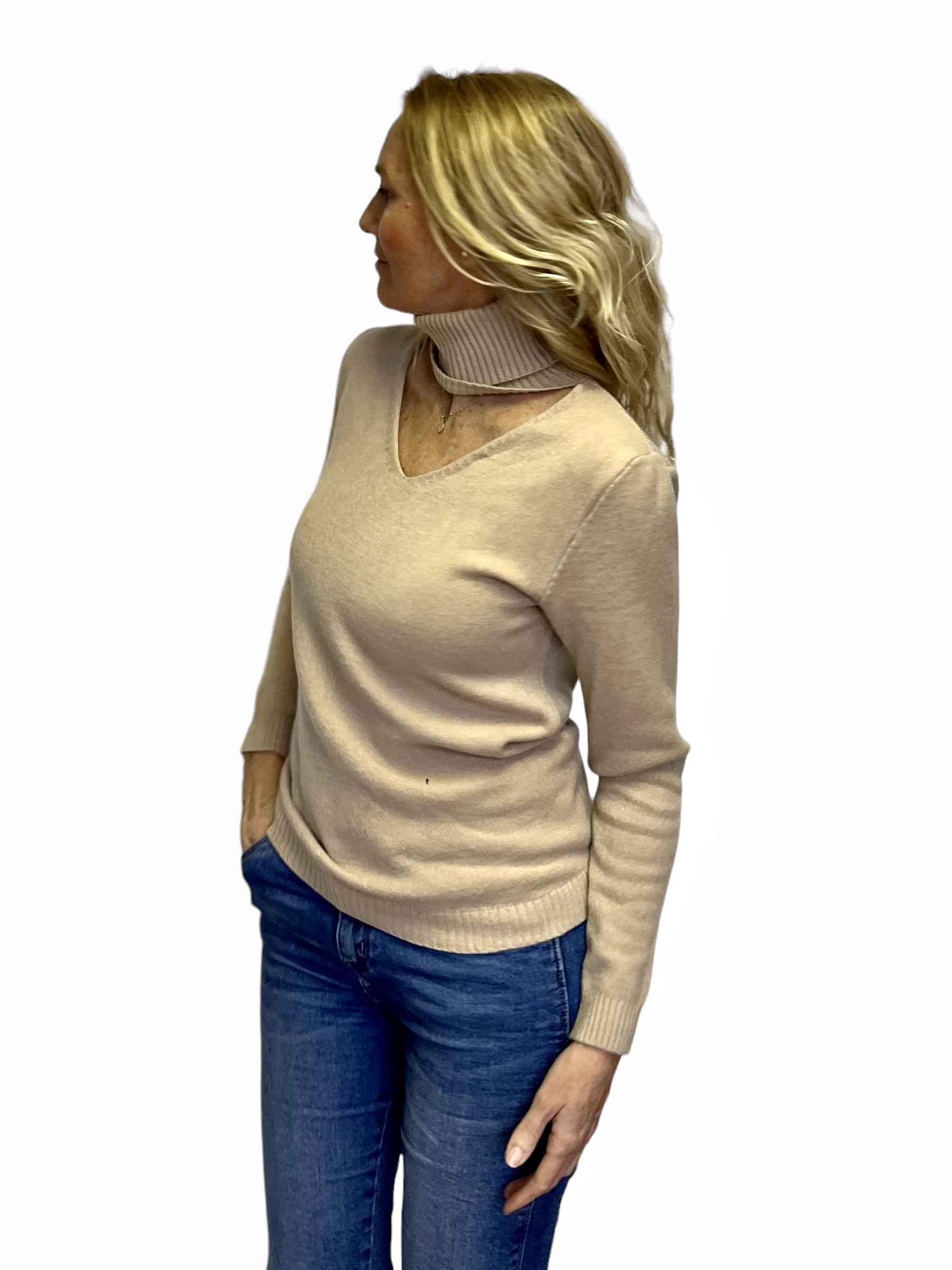 Jersey de punto con cuello alto y apertura en escote. Ideal para cualquier look.