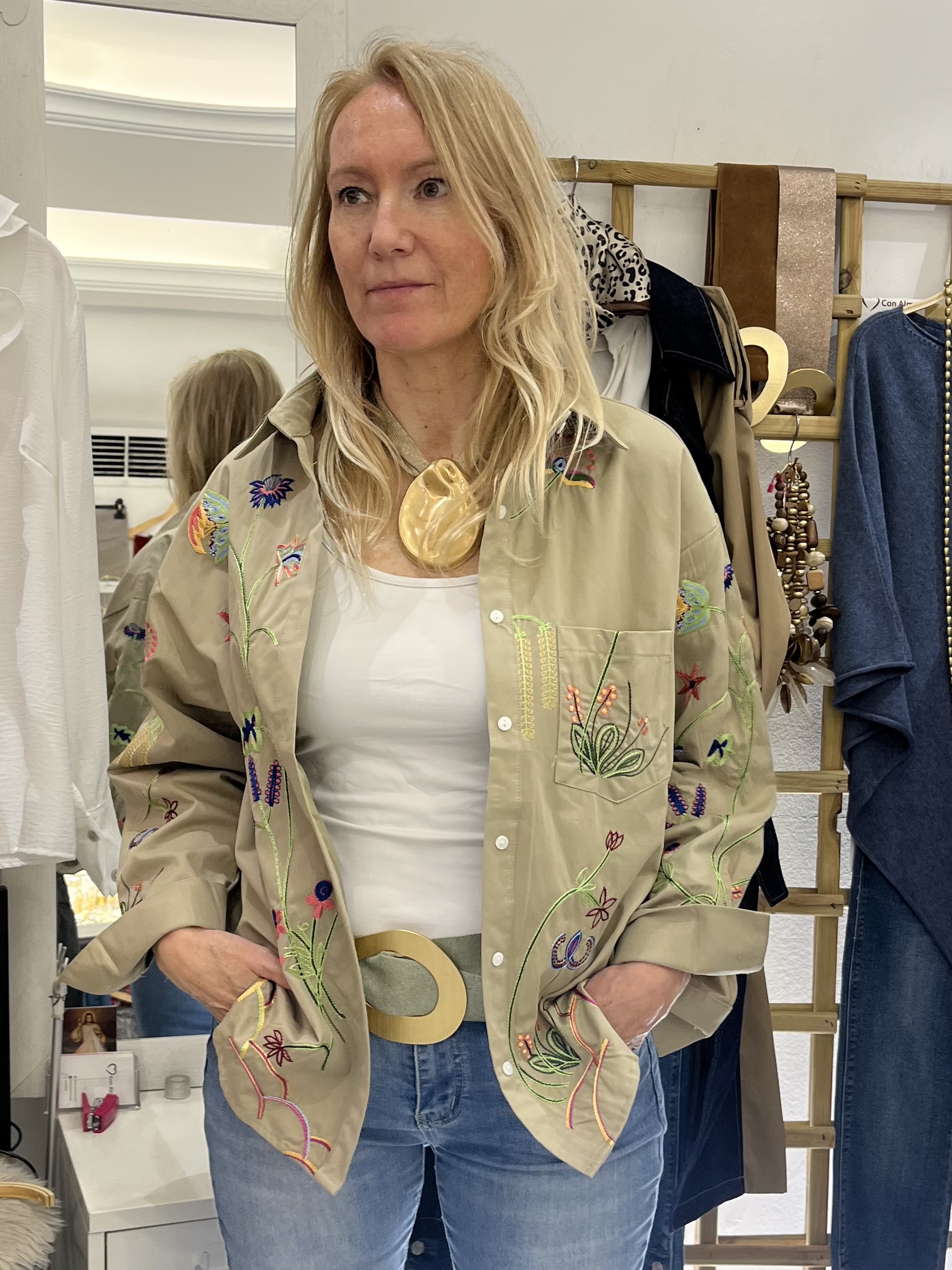 Lo más llamativo son sus bordados florales multicolores situados en la parte delantera.